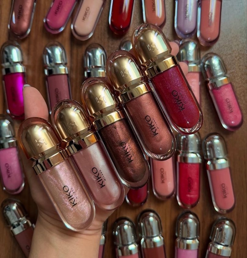 Kiko markasına ait, parlak ve çok renkli canlı tonlarda, altın kapaklı şık glosslar