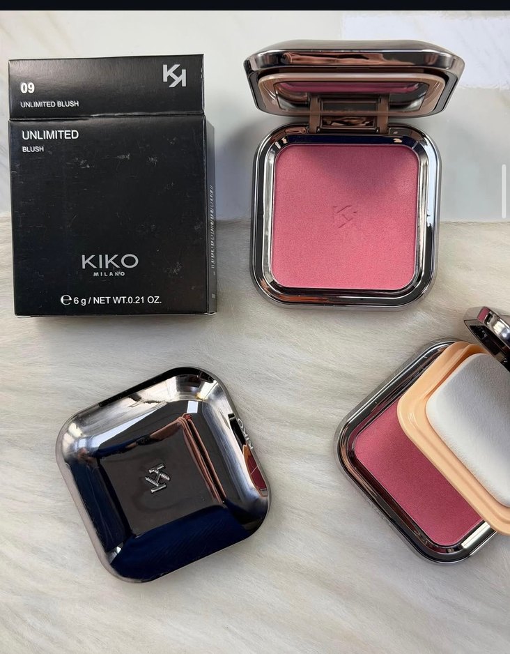 KIKO parlak pembe allık toz, 6g ağırlığında kompakt kutuda. Canlı renk ve pürüzsüz bitiş sunar. Üzerinde 'UNLIMITED' ve 'NET WT. 0.21 OZ' yazılıdır.