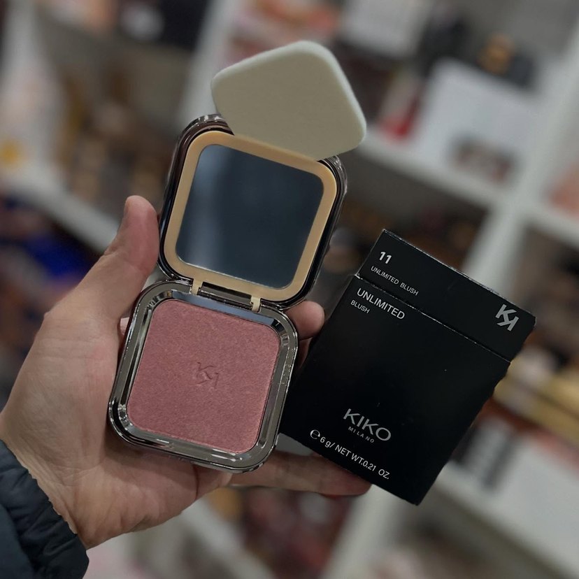 Beauty Unlimited Allık KIKO parlak pembe toz allık, kompakt ayna ve sünger aplikatör ile birlikte. Canlı renk sağlar.