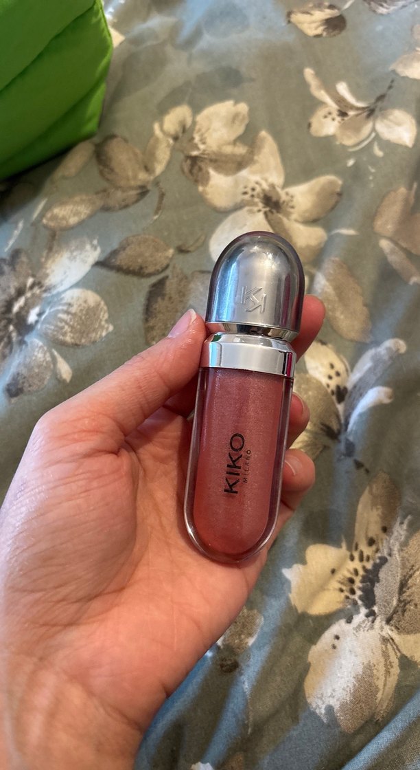 KIKO markalı, parlak bej renkli ve şık gümüş kapaklı ruj, dudaklara parlak bir görünüm sağlar.
