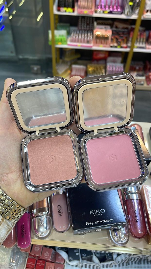 KIKO markasına ait pastel pembe toz allık, doğal bir görünüm için yumuşak dokulu. Aynalı kompakt kutuda sunulur.