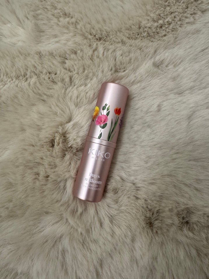 Kiko'nun pastel pembe tonunda, çiçek desenli ambalajlı ruj. Yumuşak renk ve pürüzsüz sürüm sağlar.