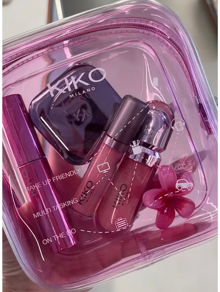 Parlak pembe plastikten yapılmış, baskılı desenli kadın makyaj çantası. "MILANO", "ON THE" ve "XIKO" yazıları içerir. Günlük kullanım için uygundur, göz alıcı ve yenilikçi tarzda.