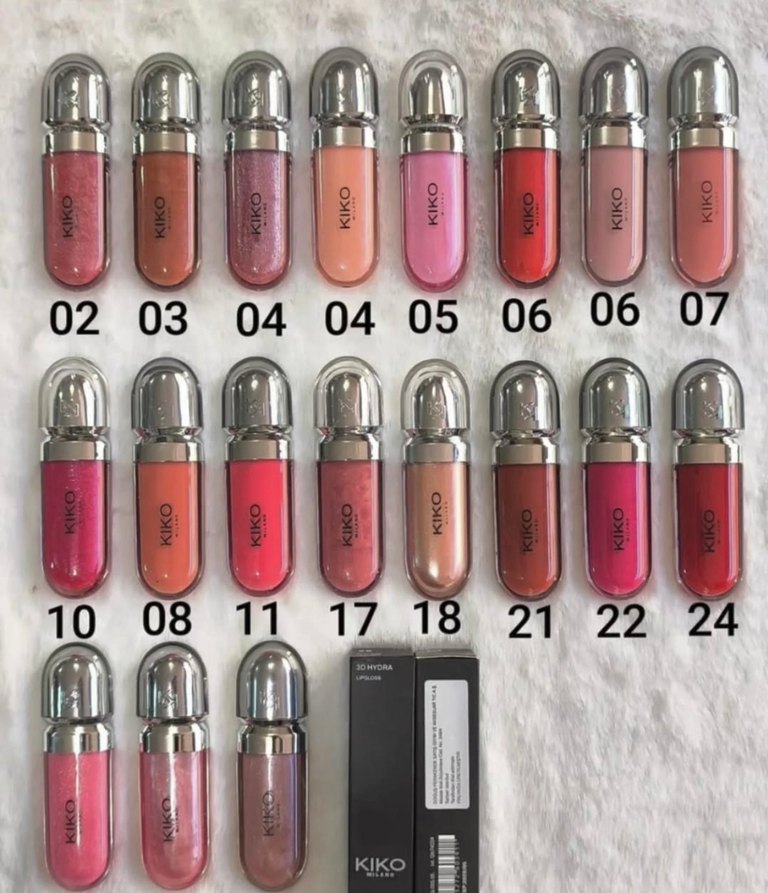 KIKO markalı, çeşitli açık pembe tonlarında parlak kapaklı rujlar içeren set.