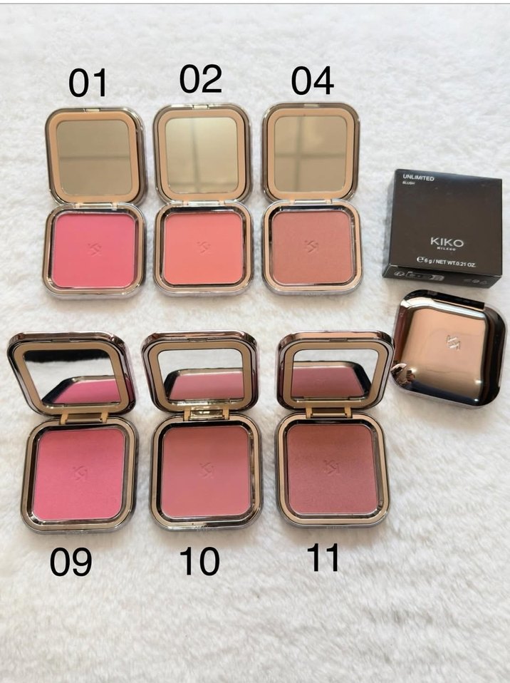 KIKO markasına ait, farklı tonlarda açık pembe toz allık seti. Her kutuda uygulama için ayna bulunmaktadır. Renk numaraları 01, 02, 04, 09, 10, 11.