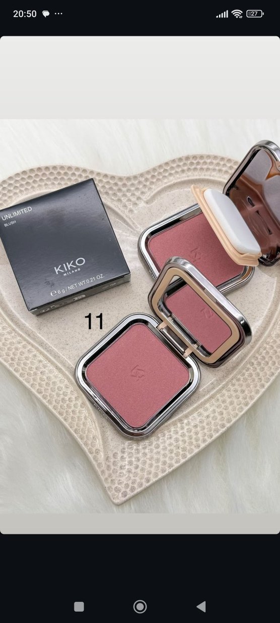 KIKO markasına ait 11 numara pastel pembe renkli pudra allık. Aynalı ve sünger aplikatörlü kompakt kutuda, yumuşak dokulu.