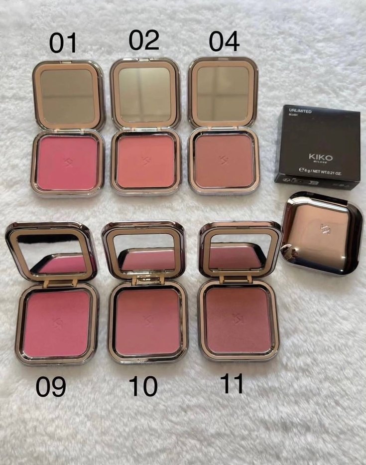 KIKO markalı, 01, 02, 04, 09, 10 ve 11 numaralı açık pembe tonlarda pudra allıklar, aynalı kompakt kutuda. Doğal bitiş için yumuşak dokulu.