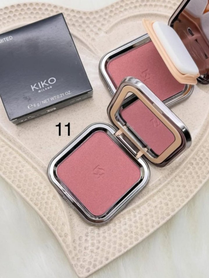 KIKO markalı, 11 numara pastel pembe renkte, aynalı kompakt kutuda pürüzsüz dokulu pudra.