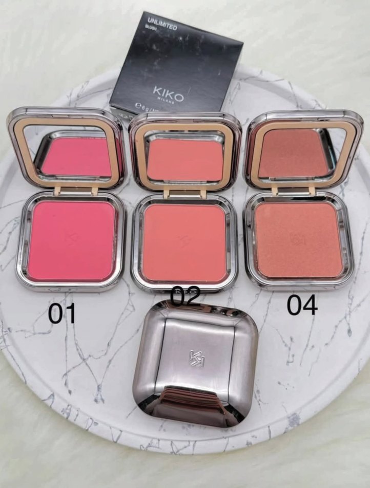 Kiko markasına ait, 01, 02 ve 04 numaralı açık pembe tonlarında üç adet kare gümüş kaplı pudra seti.