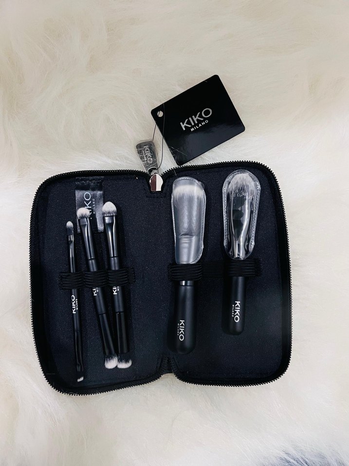 KIKO marka siyah makyaj fırçası seti, farklı fırça tipleriyle ve fermuarlı kutusunda düzenli saklama sağlar. ️