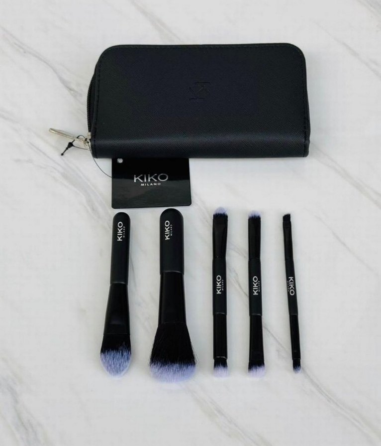 KIKO markasına ait siyah saplı, yumuşak kıllı beş makyaj fırçası ve siyah fermuarlı taşıma kılıfı içerir. ️