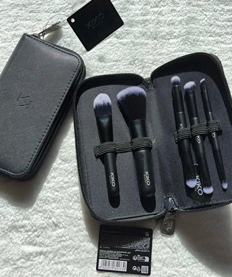 KIKO makyaj fırça seti, yumuşak kıllara sahip siyah fırçalardan oluşur ve kompakt siyah taşıma çantasında düzenli şekilde saklanır. ️