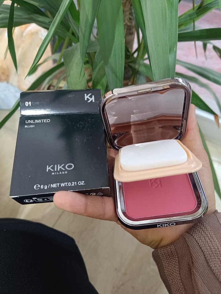 KIKO Unlimited pastel pembe allık, 6g ürün miktarı ile pürüzsüz bir görünüm sağlar. Kompakt kutuda sünger aplikatör ile sunulur.