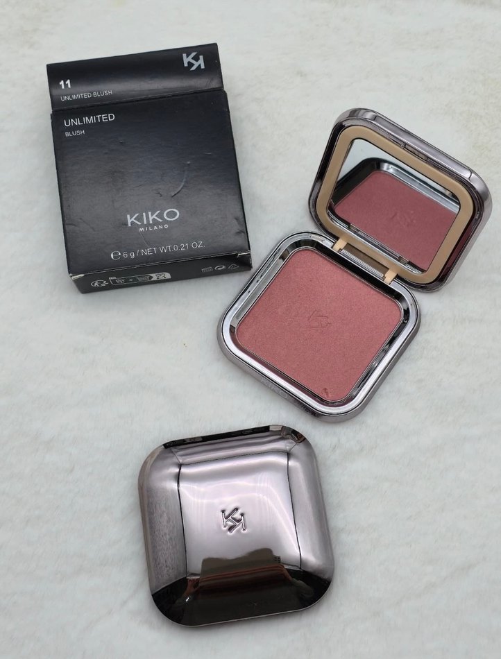 KIKO Unlimited pembe allık, gri şık kutusunda ayna ile birlikte. Pürüzsüz uygulama ve doğal renk sağlar.