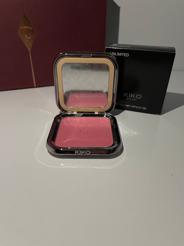 KIKO UNLIMITED koyu pembe renkli allık, kompakt aynalı. Yanaklara doğal ve pürüzsüz bir görünüm sağlar.
