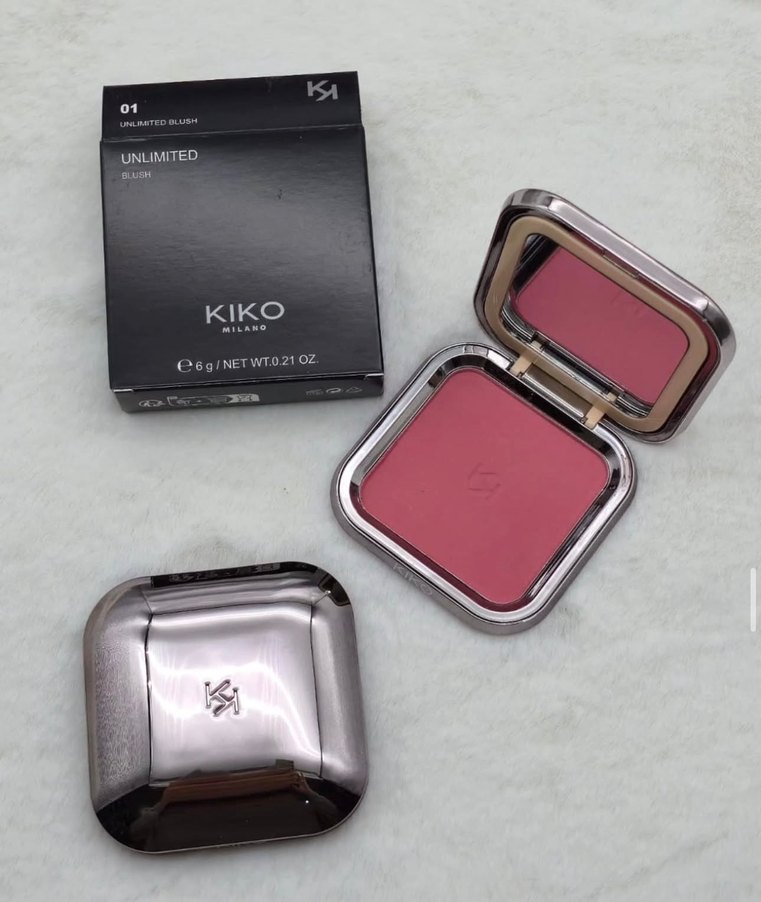 KIKO Unlimited pembe allık, yumuşak dokulu. Şık, aynalı metal kutuda, 6g net ağırlıkta.