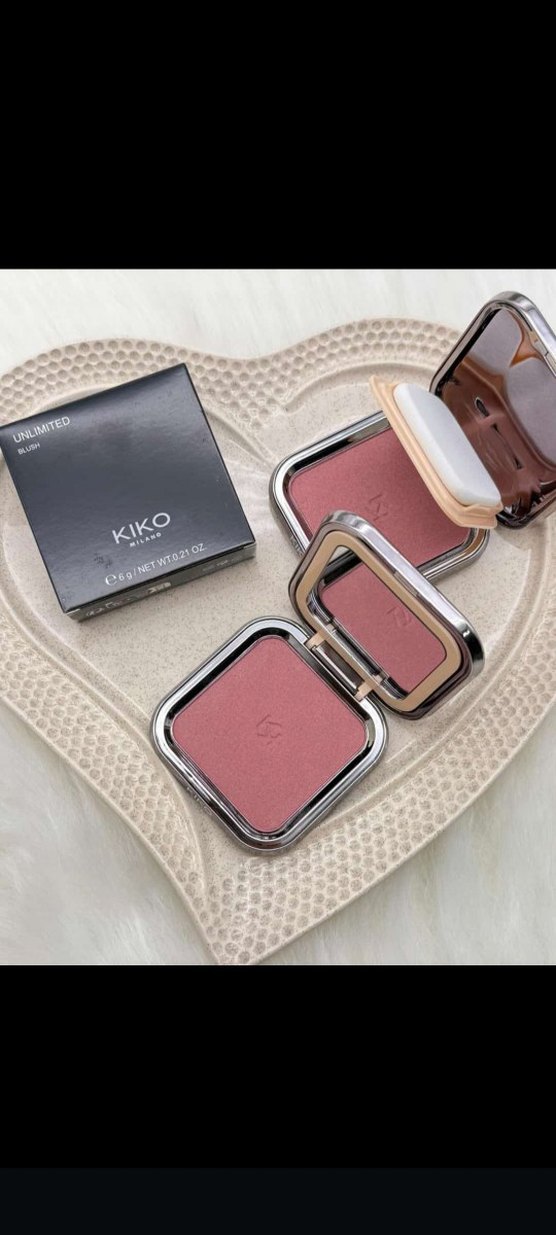 KIKO Unlimited pudra allık, pastel bej tonunda, yumuşak ve doğal bir görünüm sağlar. Kompakt kutuda ayna ve aplikatör bulunur.