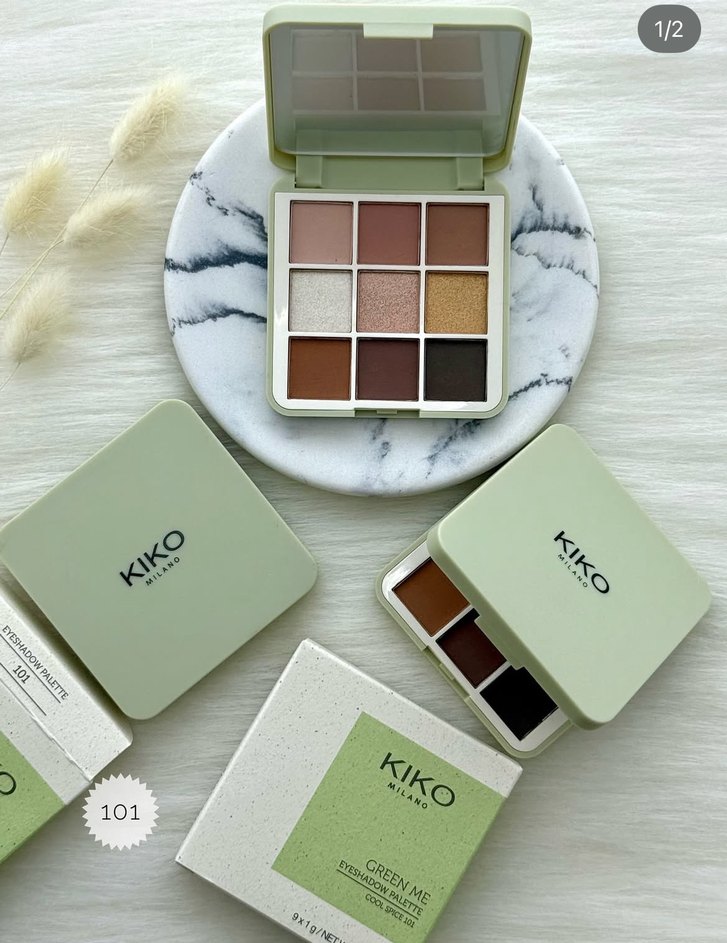 KIKO Green Me far paleti, mat ve ışıltılı dokularda açık-koyu arası dokuz yeşil ton içerir.