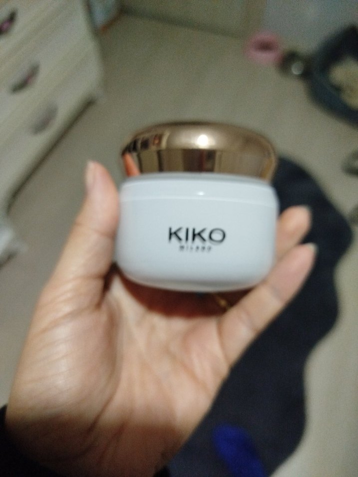 KIKO yuz kremi, beyaz bir kapta ve altın renkli kapaklıdır. Cilde nemlendirici bakım sağlar.