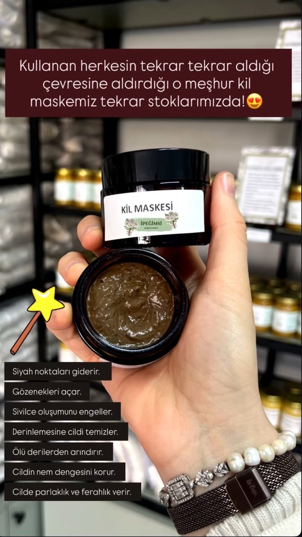 Kil maskesi, siyah noktaları giderir, gözenekleri açar, sivilce oluşumunu engeller ve cildi derinlemesine temizler. Cildin nem dengesini korur ve ölü derilerden arındırır.