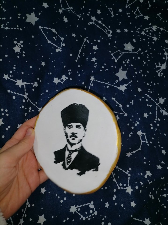 Beyaz zemin üzerine siyah-beyaz Atatürk portresi bulunan, altın renkli detaylı kil tabaka.
