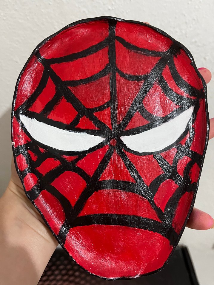 Kırmızı renkte, siyah ağ desenleri ve beyaz gözlere sahip Örümcek Adam maskesi şeklinde kilden figür. ️