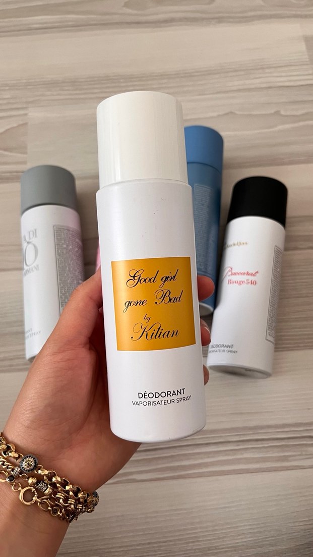 Kilian Good Girl Gone Bad kadın deodorant spreyi, uzun süre kalıcı ferahlık ve zarif bir koku sunar. Beyaz şişesi üzerindeki altın renkli etiket dikkat çeker.