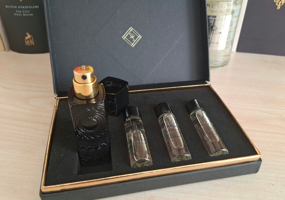 Delux üründür. Neredeyse hiç kullanılmamış gibidir. Taşıma şişesi ağır metalden mıknatıs kapaklı oldukça lux bir settir. Her 7.5ml lik cam şişe de açılıp tekrar doldurulabilir refill şişelerdir.