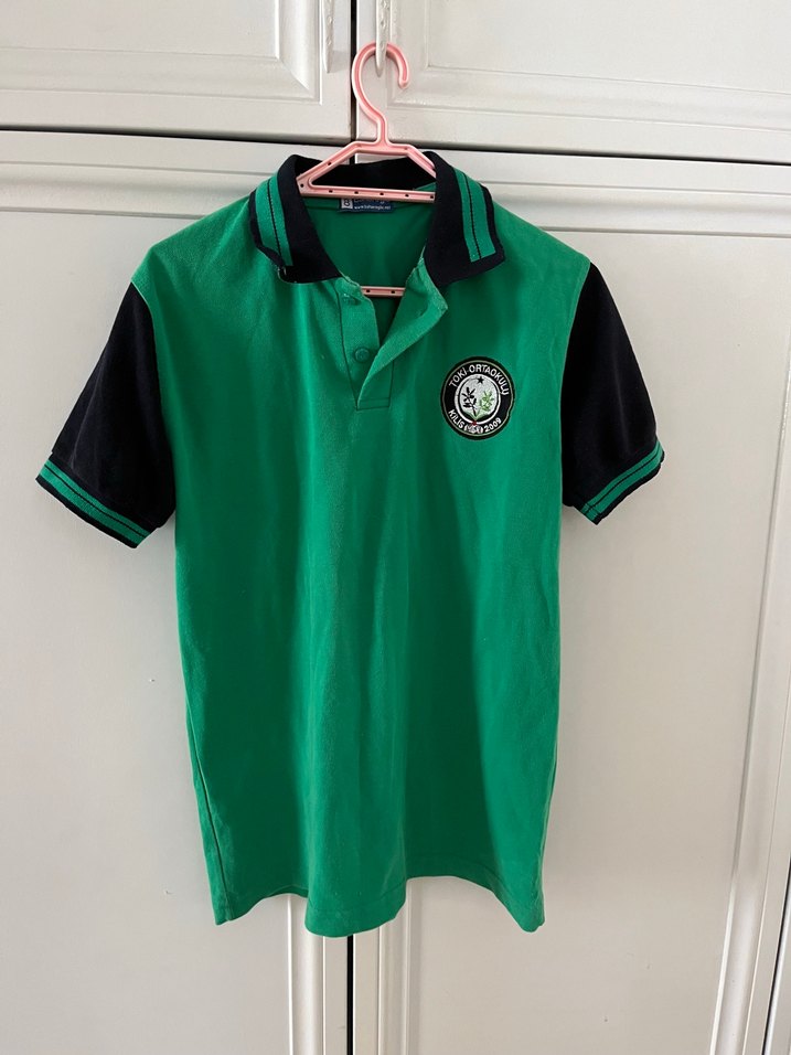 Düğmeli ön kısmı, baskılı logo ve kısa kollu yeşil-siyah renkli erkek polo tişört. Rahat kesimli, sentetik kumaştan, günlük kullanıma uygun.