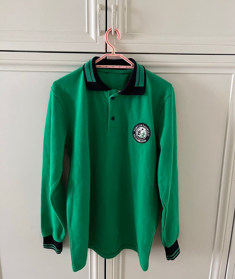 Uzun kollu, düğmeli yakaya sahip yeşil erkek polo tişört. Göğüste baskılı amblem bulunur. Rahat kesim ve sokak stili, yumuşak ve sıcak kumaştan yapılmıştır.