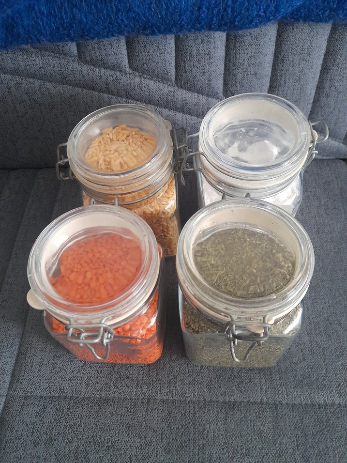 Kilitlemeli kapaklı, çeşitli kuru malzemeleri saklamak için uygun gri cam kavanoz seti.