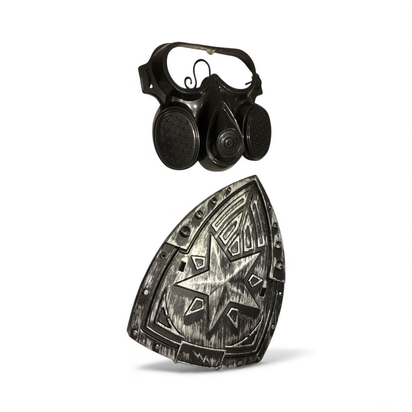 Kamuflaj desenli, kilitli tasarıma sahip gri ve siyah metal erkek aksesuarları. Maske ve yıldız detaylı kalkan içerir. ️