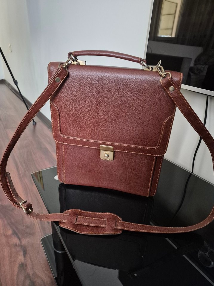 Kilitli kapaklı, koyu kahverengi vintage erkek evrak çantası. Üst sapı ve ayarlanabilir askısı ile klasik ve şık bir görünüm sunar.