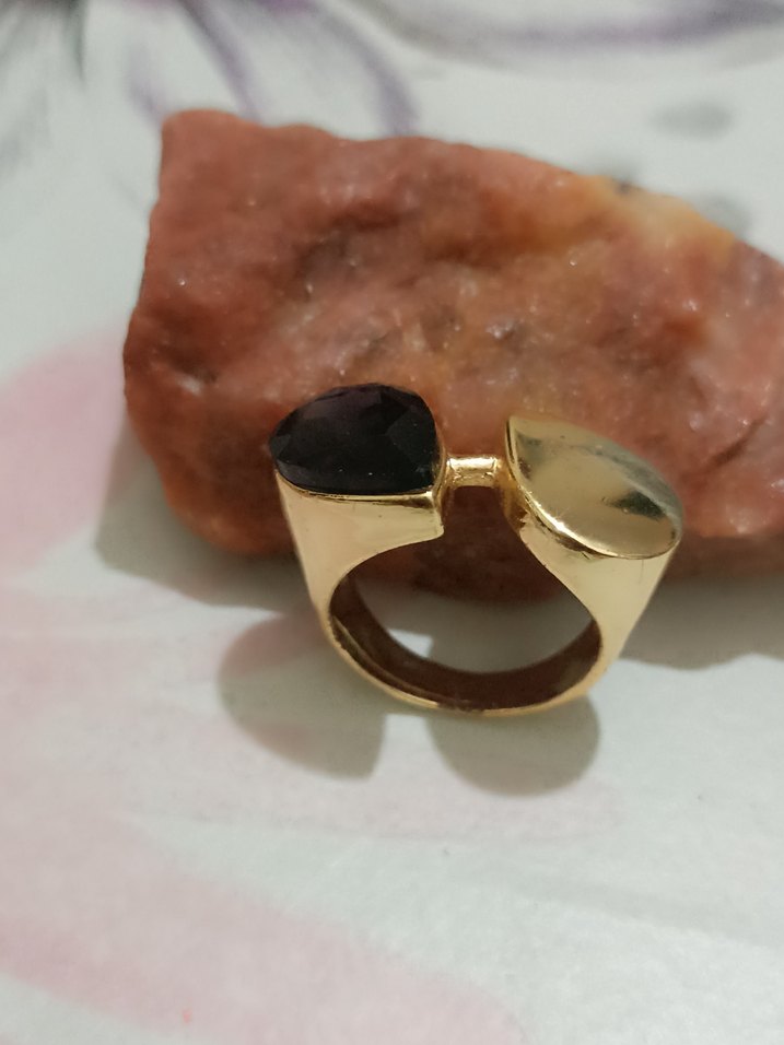 Bu altın yüzük, koyu mor renkte ve desensiz bir taşla kilitli benzersiz bir tasarıma sahiptir. Çağdaş tarzı, romantik buluşmalar için trend belirleyicilere uygundur.