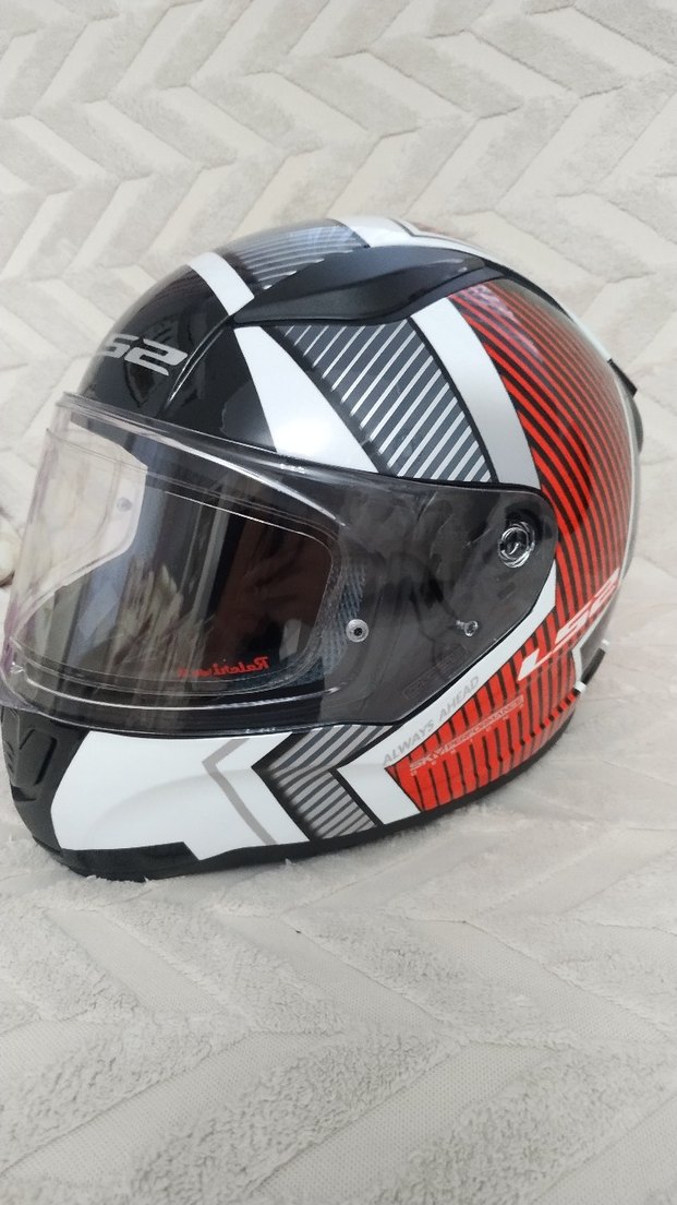 Kilitli, kauçuk malzemeden yapılmış, siyah renkli baskılı kırmızı ve beyaz desenlere sahip biker motosiklet kaskı M beden