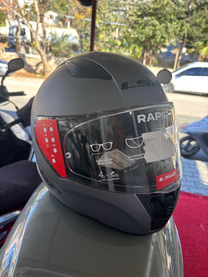 Kilitli tasarıma sahip siyah baskılı biker motosiklet kaskı, 'RAPI' yazılı şeffaf vizör ve sağlam kauçuk yapıyla dikkat çekiyor. ️