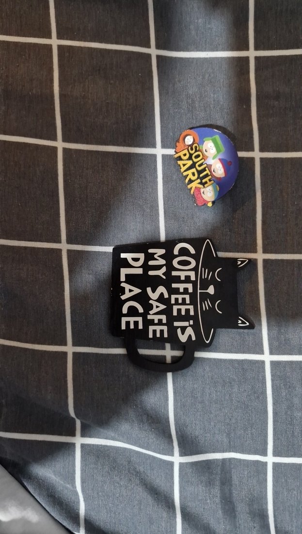 Kilitli siyah çocuk cüzdanı, üzerinde baskılı kedi deseni ve "COFFEE IS MY SAFE PLACE" yazısı vardır. Sokak stili ve rock punk havası taşır.