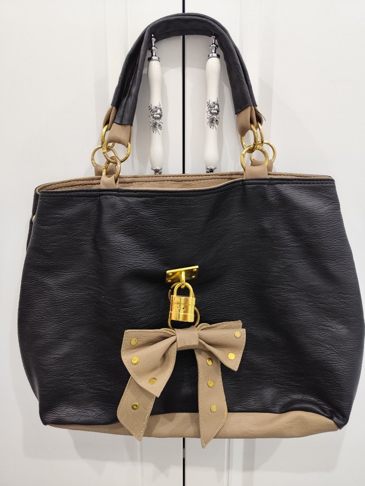 Parlak siyah deri kadın çanta, altın perçinli bej fiyonk ve altın kilit tokalı. Gotik tarz ile klasik şıklığı günlük kullanım için birleştirir.