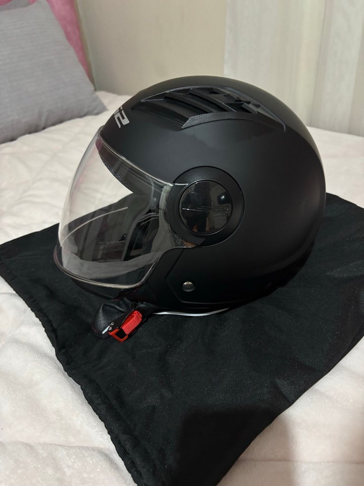 Kilitli kayışlı ve şeffaf vizörlü siyah minimalist biker motosiklet kaskı. Sağlam plastikten, desen içermeyen rock punk tarzı. Hiç kullanılmadı. Sorunu yoktur.