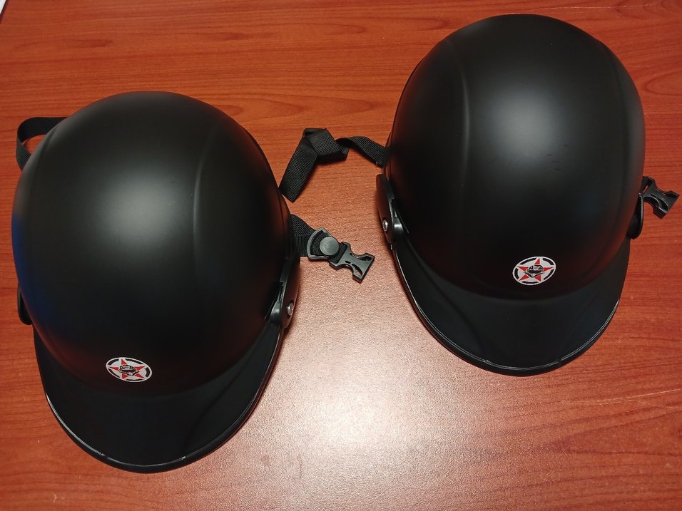 Kilitli kayışlı, kauçuk malzemeden yapılmış siyah biker motosiklet kaskı. Minimalist ve desensiz tasarım, koyu renkte. ️