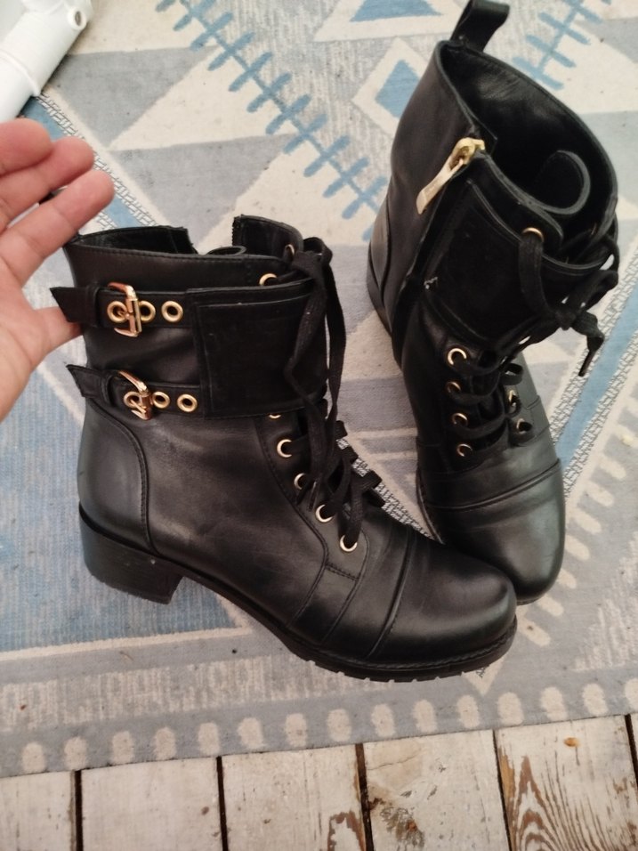 Kilitli kayışlara ve desenli detaylara sahip blok topuklu siyah deri botlar, trend ve günlük kullanım için uygundur. geçen sene aldım flower marka orijinal deri 11.000 TL'ye aldım fazla girmedi