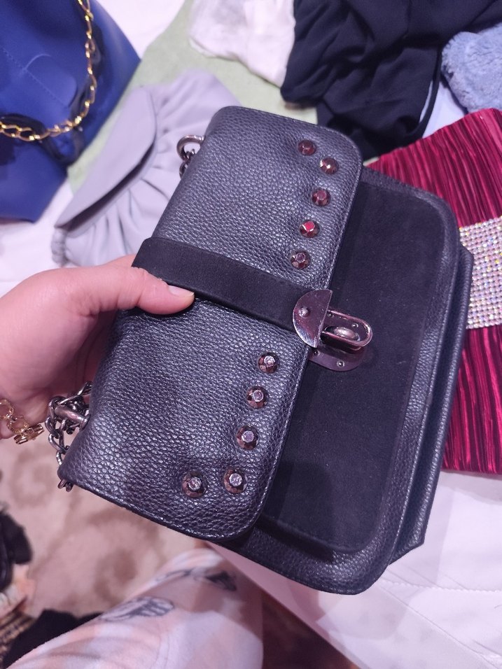 Siyah deri, kilitli ve perçin detaylı kadın çantası. Gotik tarzda, Parisli rock punk havası taşıyor. Günlük kullanıma uygun.