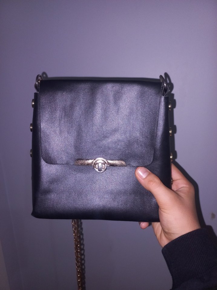 Kilitli kapaklı, zincir askılı siyah deri gotik tarzda kadın çanta. Günlük kullanıma uygun, trend bir görünüm sunar.