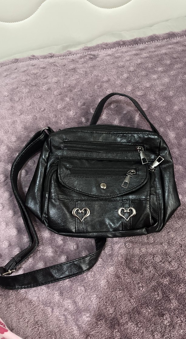 Siyah deri, kilitli detaylı, çoklu fermuarlı bölmeleri olan gotik tarzda kadın çantası. Günlük kullanıma uygun, rock punk havasında. Hiç kullanılmamıştır.