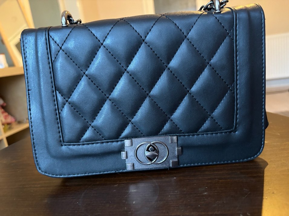 Kilitli tokalı, siyah, kare desenli kadın çantası. Modern klasik ve Paris tarzını yansıtır. Günlük kullanıma uygundur.