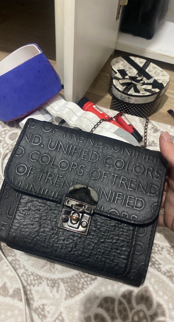 Kilitli kapanışa sahip siyah deri kadın çantası, üzerinde trend yazılı kabartma desen bulunur. Günlük sokak stili için uygundur.