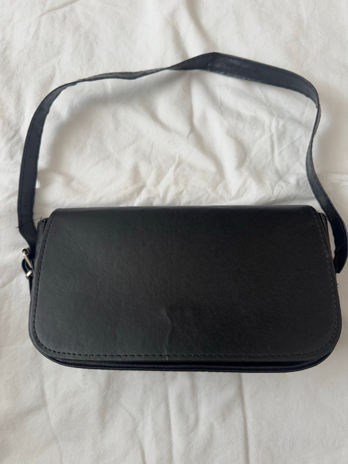Siyah deri, kilitli tasarıma sahip, minimalist gotik stilde sade kadın çantası. Günlük kullanım için uygun, düz ve desensiz yüzeyli.