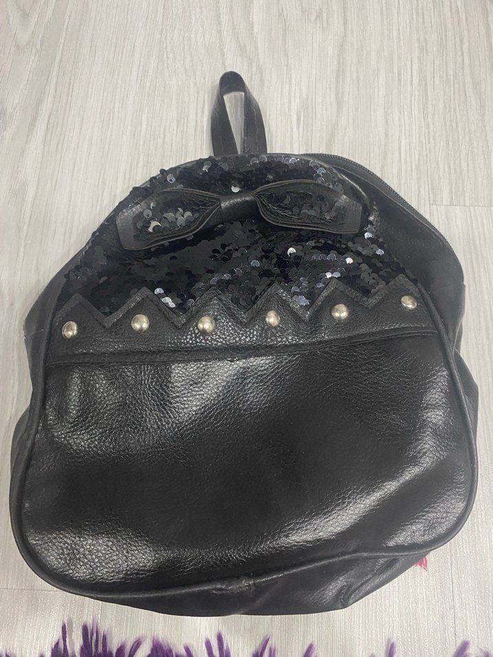 Siyah deri sırt çantası, kilitli detaylar ve nakışlı desenlerle rock punk ve gotik tarzını yansıtıyor. Günlük kullanıma uygun koyu ve asi tasarım sunar. Defoları bulunur