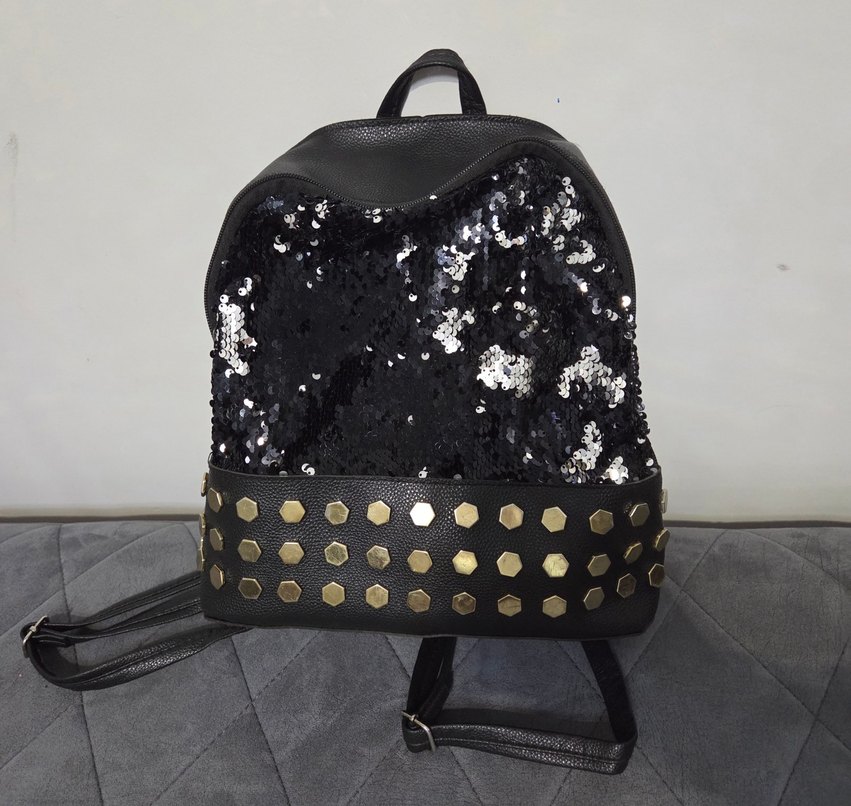 Kilitli kayışları, pul ve metal çivilerle süslenmiş siyah deri sırt çantası. Rock punk tarzını yansıtır, günlük kullanıma uygundur. Fermuar kenarında söküğü var. Dikilebilir. Fermuarın açılıp kapanmasına engel değildir. Bu şekilde de kullanılıyor. Marka temsilidir.