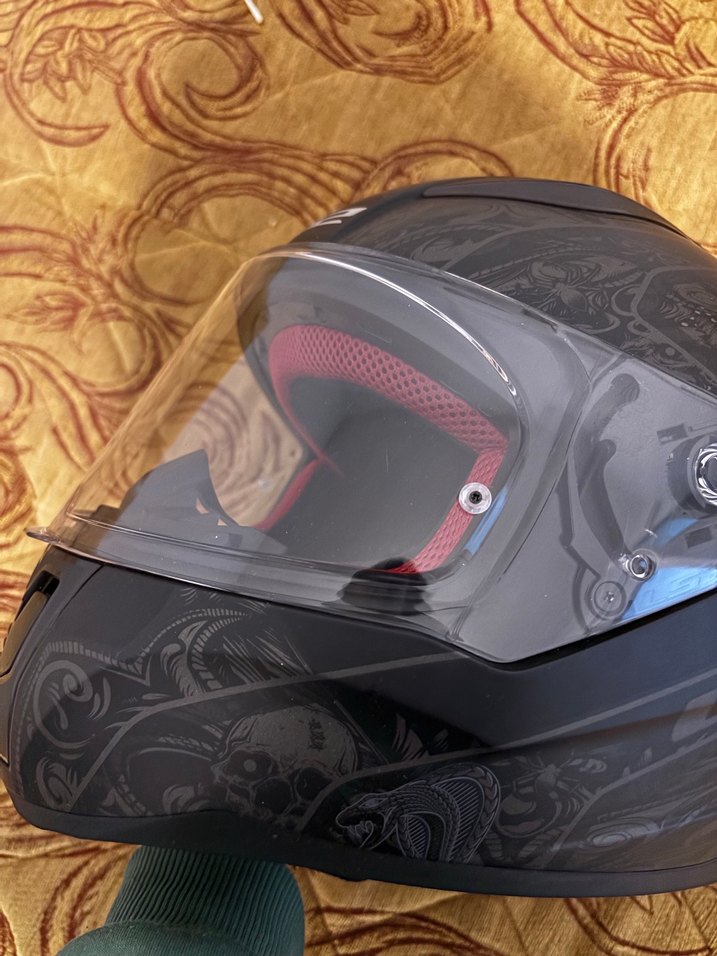 Sentetik kumaştan, kilitli kapamalı siyah gotik desenli motosiklet kaskı. Trend belirleyici ve avangart tarzda. ️